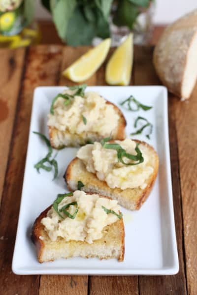 You'll love the creamy white bean puree piled ontop of crusty bread as snack or at party.